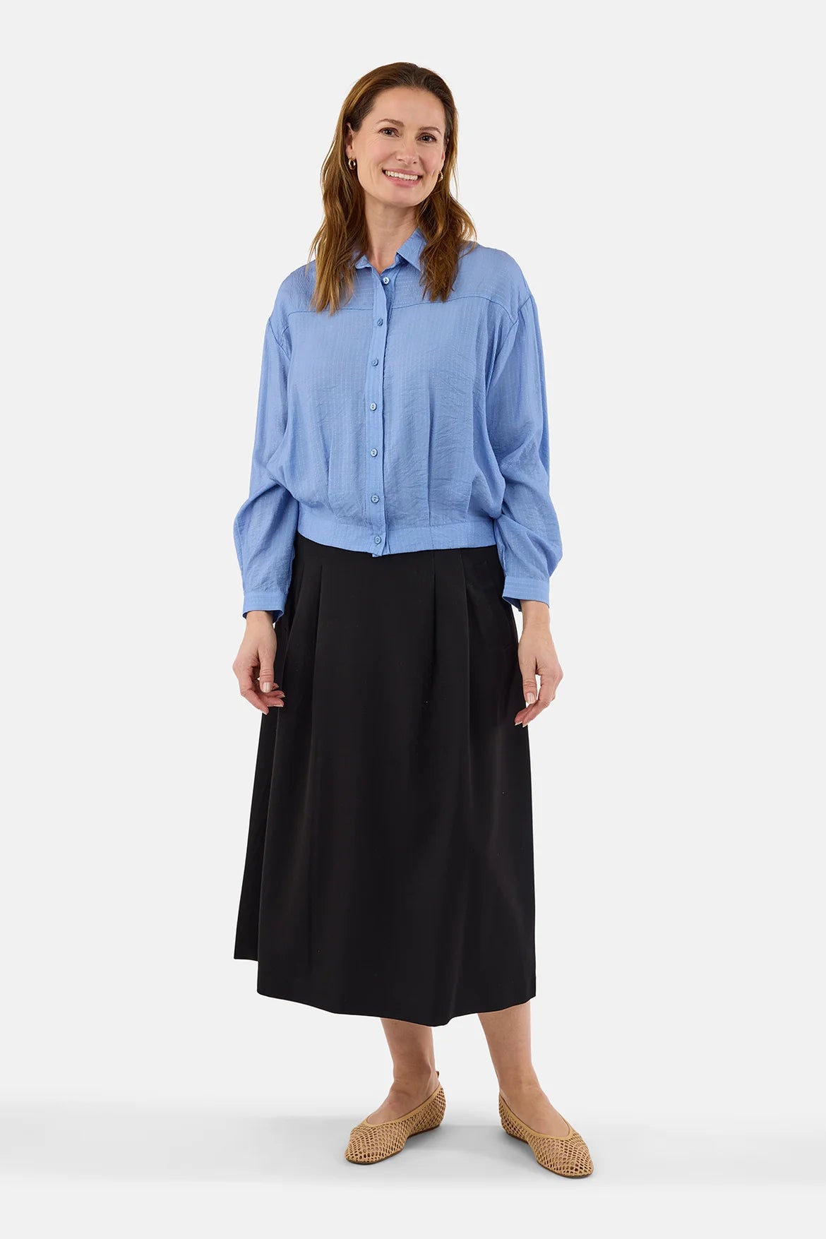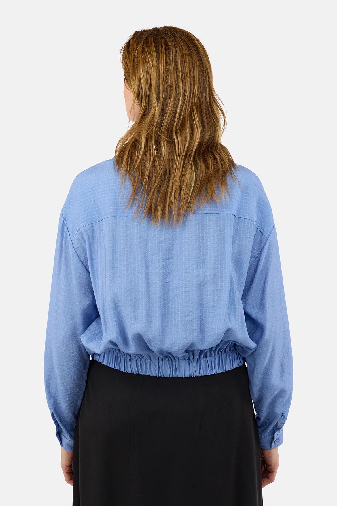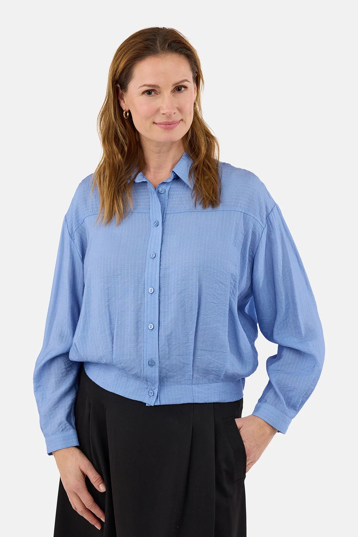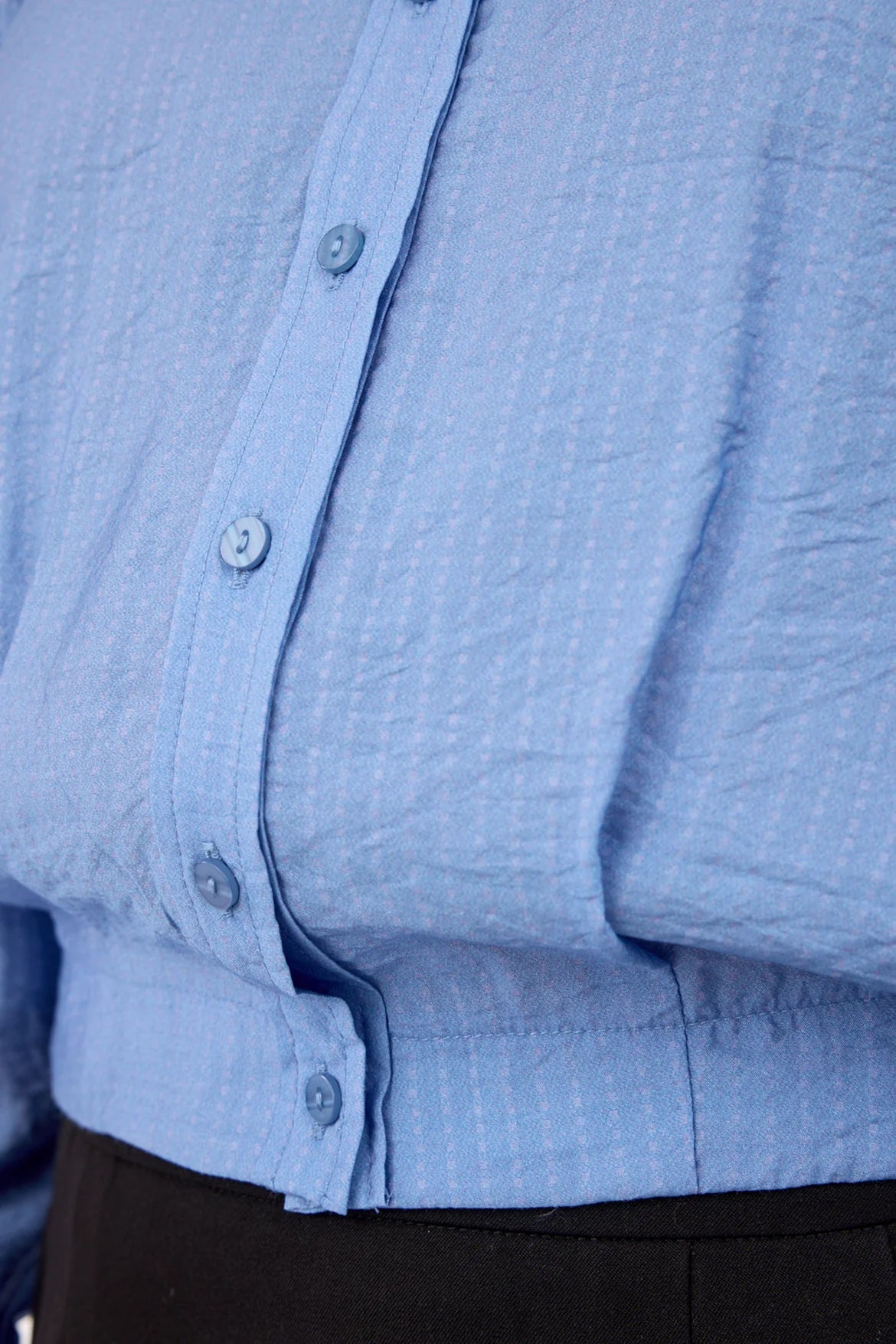 Elevate your everyday wardrobe with this versatile blue textured button-up shirt. The classic design features a comfortable elasticated waist that adapts to your shape, offering both style and ease of movement. Perfect for casual outings or smart-casual occasions, the textured fabric adds visual interest while maintaining a polished appearance. The button-up front allows for effortless layering and styling flexibility. A timeless piece that transitions seamlessly from day to night.