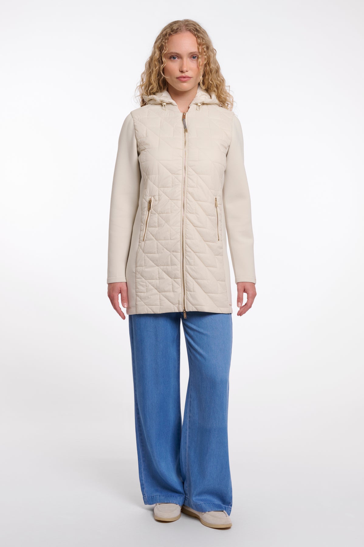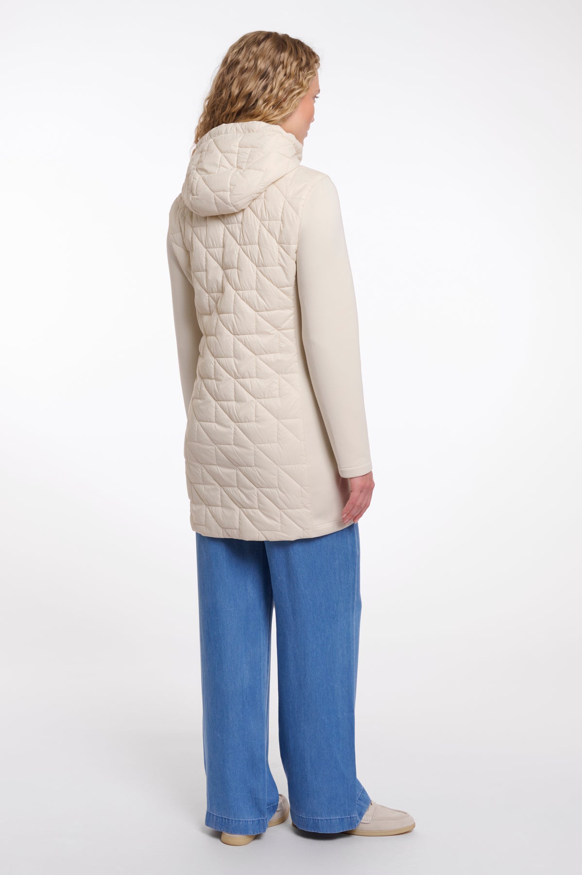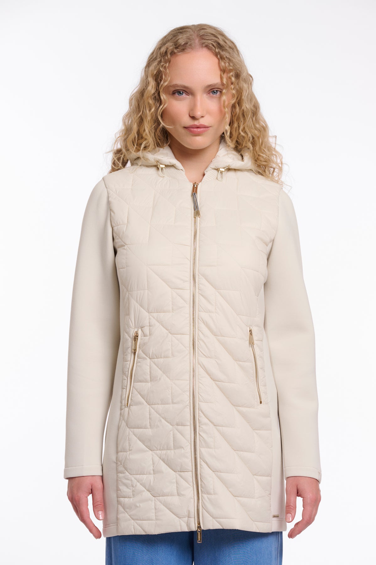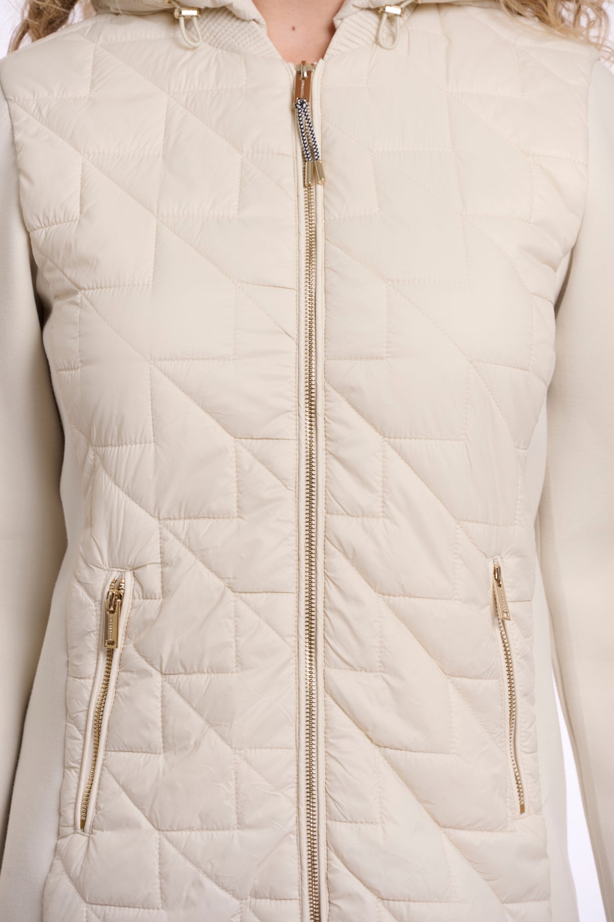 Stay effortlessly chic in this mid-length coat, designed with a padded body, smooth fabric sleeves, and a streamlined zip-front closure. Functional zip pockets add practical ease, while the adjustable hood with subtle drawcords offers extra comfort and protection.