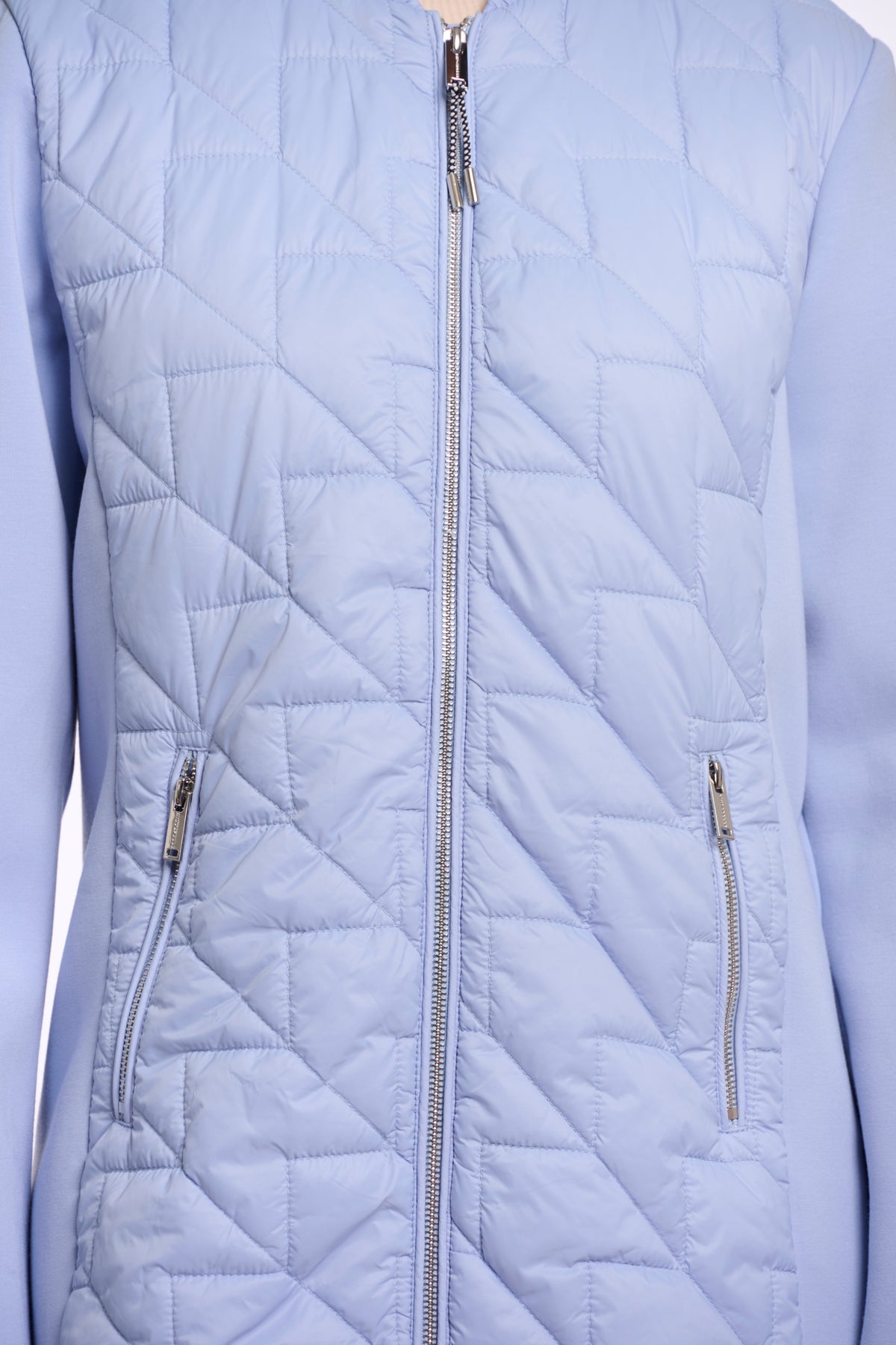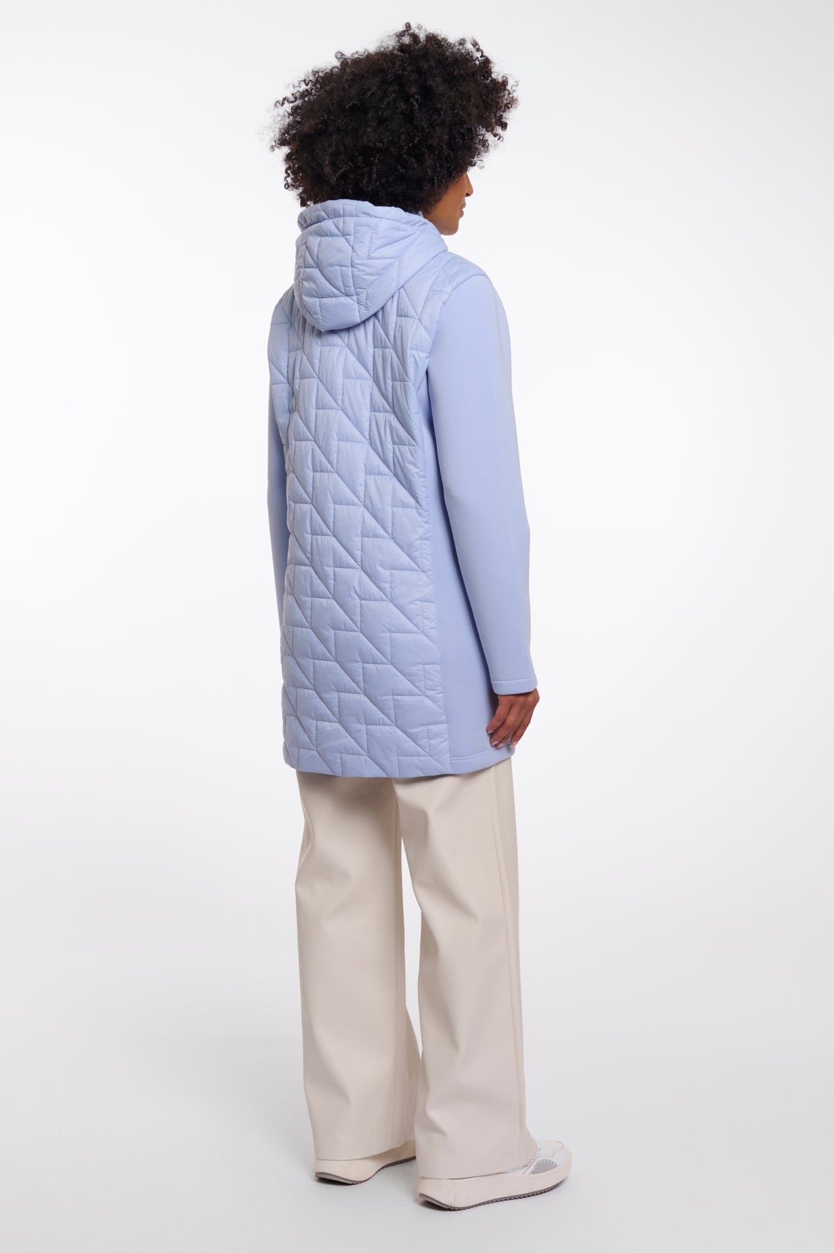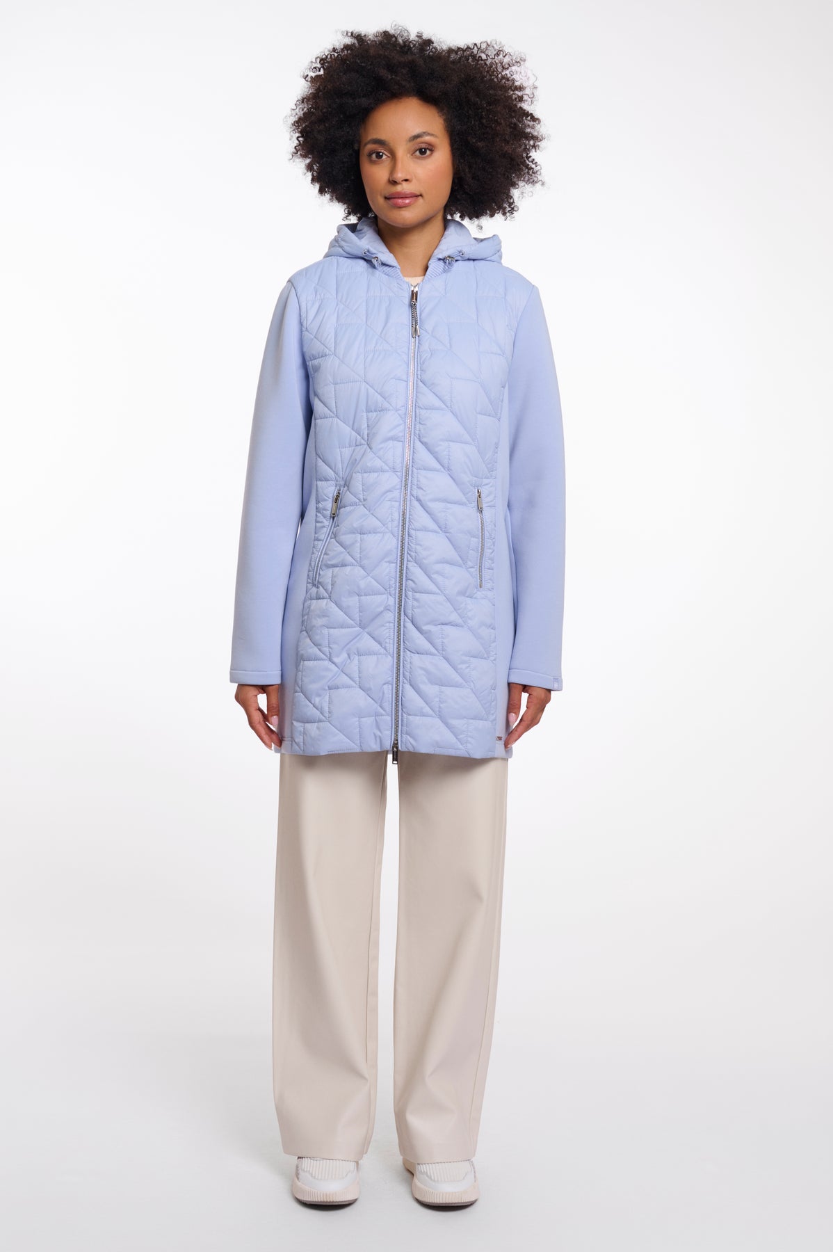 Stay effortlessly chic in this mid-length coat, designed with a padded body, smooth fabric sleeves, and a streamlined zip-front closure. Functional zip pockets add practical ease, while the adjustable hood with subtle drawcords offers extra comfort and protection.