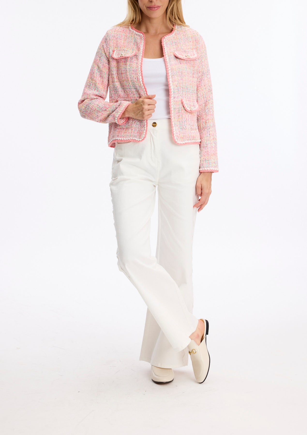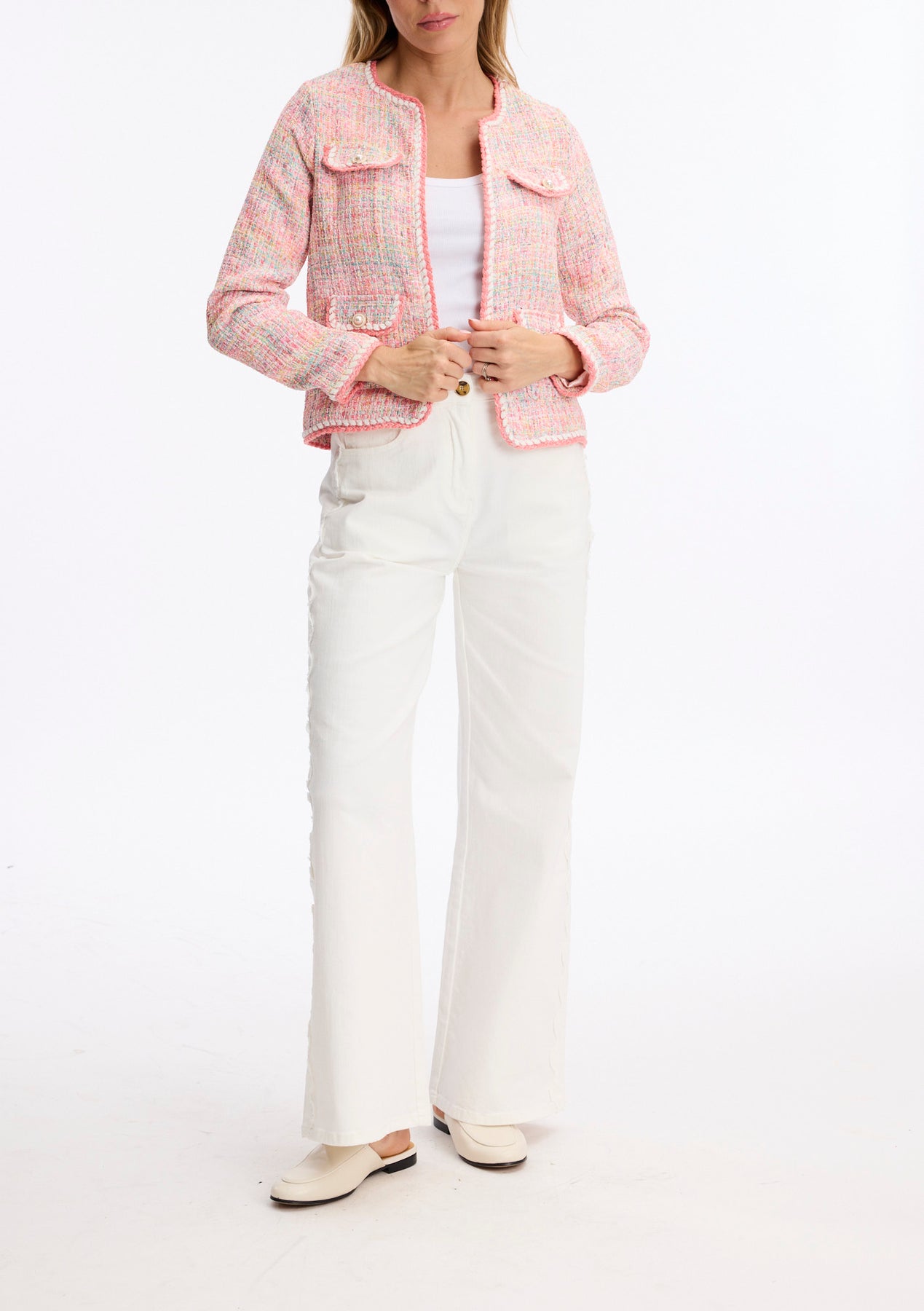 Elevate your wardrobe with this striking multicoloured tweed jacket, a timeless piece that blends classic sophistication with contemporary style. Crafted from quality tweed fabric in a rich palette of complementary hues, this jacket features elegant pearl button detailing that adds a refined touch to every wear. Perfect for layering over dresses, knitwear, or casual basics, this versatile jacket transitions seamlessly from office to weekend. The structured silhouette flatters the figure while the intricate tweed texture brings depth and visual interest. Pearl buttons catch the light beautifully, elevating the overall aesthetic. An investment piece that pairs effortlessly with neutral or patterned pieces, this jacket is ideal for those who appreciate quality craftsmanship and enduring style. Whether you're dressing up for a special occasion or adding polish to everyday looks, this multicoloured tweed jacket is a wardrobe essential.