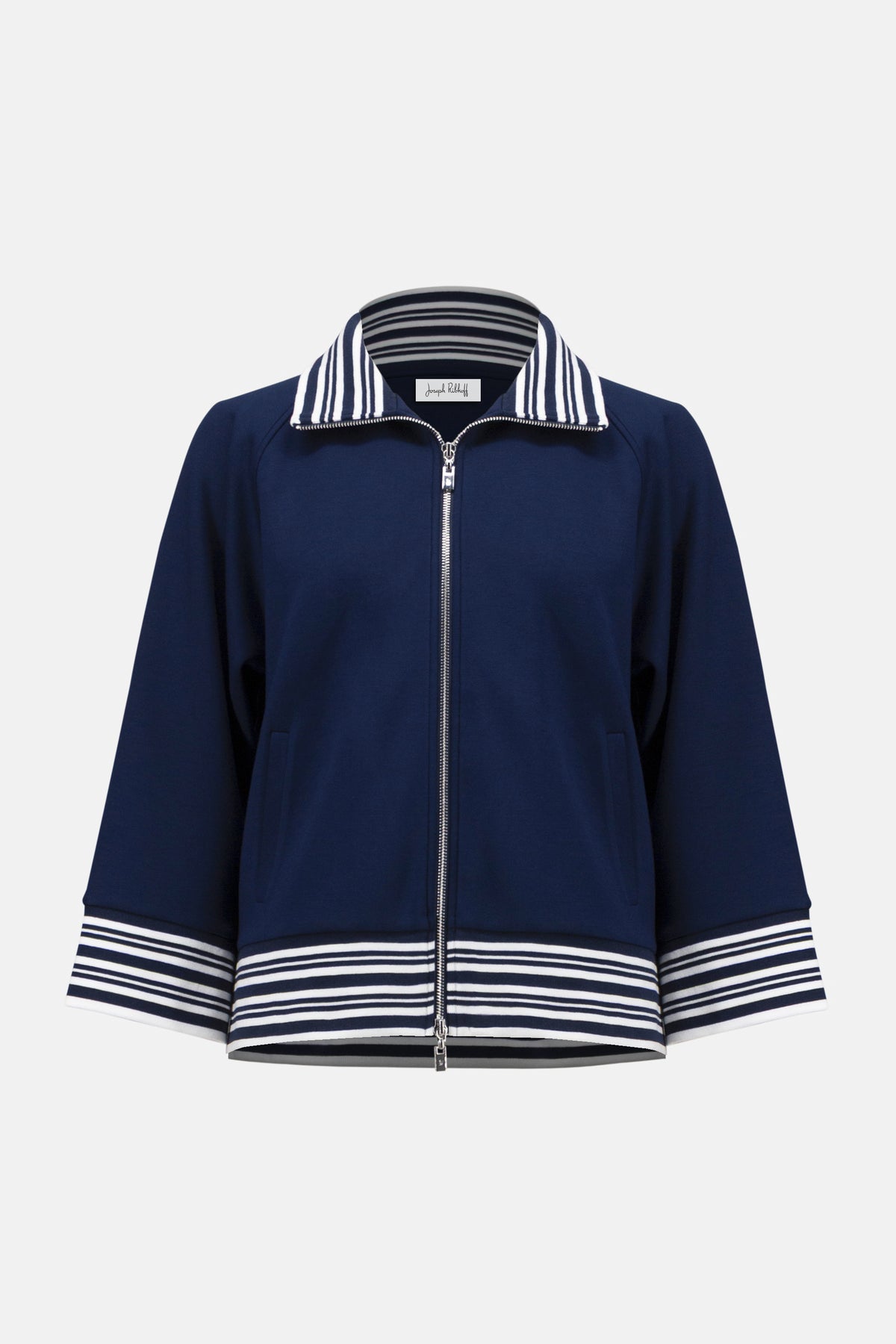 This scuba jersey jacket blends sporty flair with polished edge. Featuring a metallic front zipper, striped rib trim and three-quarter raglan sleeves, it’s made for easy layering without compromising style.