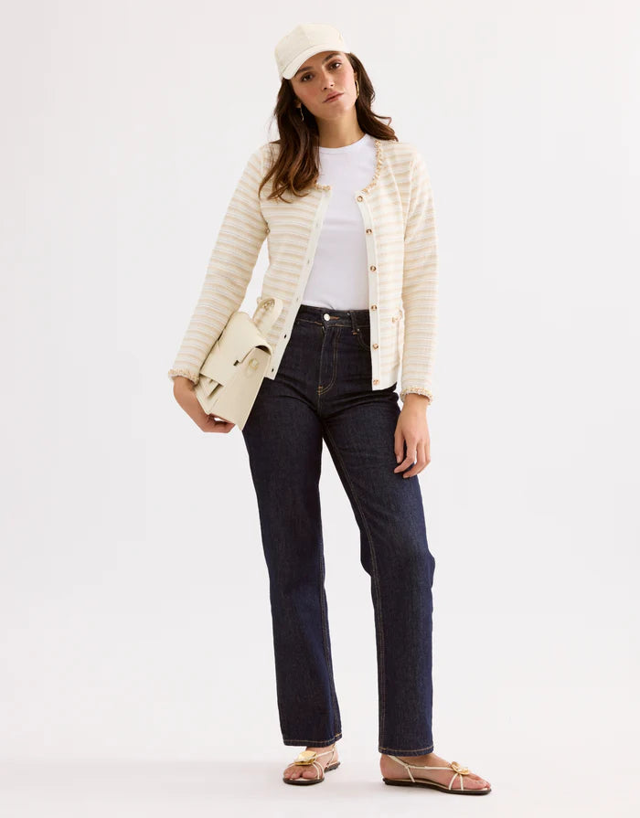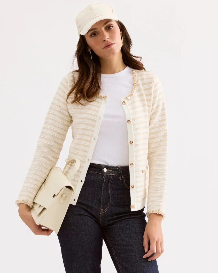 Elevate your everyday wardrobe with this sophisticated beige and off-white cardigan, where timeless elegance meets modern charm. The carefully placed embellishments add a touch of refined glamour, transforming this versatile layer into a statement piece perfect for both casual outings and polished occasions. Crafted for comfort and style, it pairs effortlessly with your favourite pieces while bringing an instant sense of refinement to any look. A wardrobe essential that delivers both warmth and undeniable sophistication.