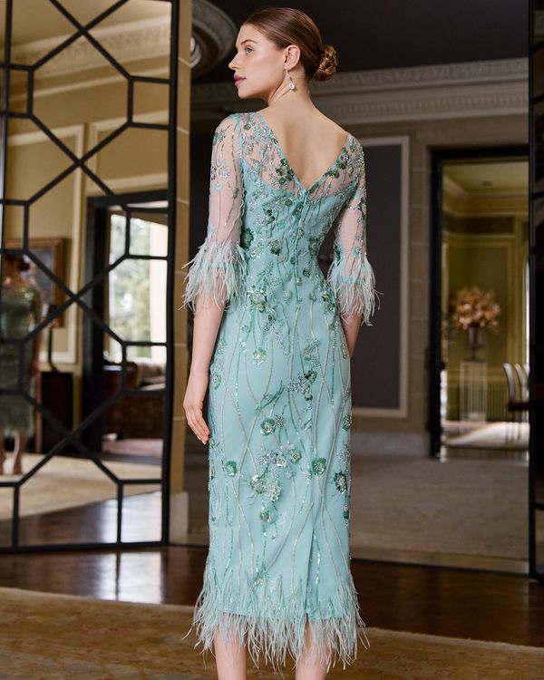 Mint Dress with Beading, V-back, and Feathers