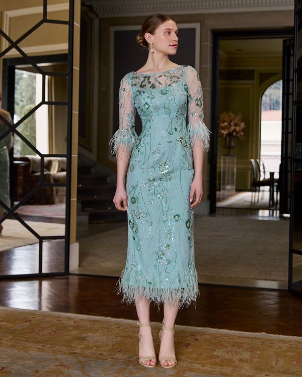 Elevate your evening elegance with this stunning mint dress, a showstopping piece that commands attention. Intricate beading catches the light with every movement, while delicate feathers add an ethereal, luxurious dimension. The striking V-back design creates a sophisticated silhouette that's both daring and refined. Perfect for special occasions, galas, or moments when you want to feel absolutely radiant. This dress transforms you into the most memorable guest in the room.
