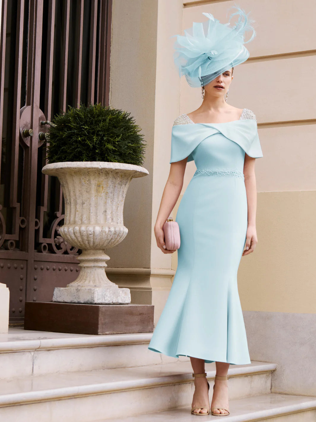 Exuding refined elegance, this exquisite midi dress is the perfect choice for Mothers of the Bride or Groom. The design showcases graceful ivory cape sleeves that drape beautifully over the shoulders, leading to a striking oversized bow at the back for a touch of couture drama. Intricate embellishment at the shoulders and waistband adds a subtle shimmer, while the fishtail hem enhances the silhouette with feminine flair and movement. Perfect for weddings or any special celebration, this dress blends modern sophistication with timeless charm.