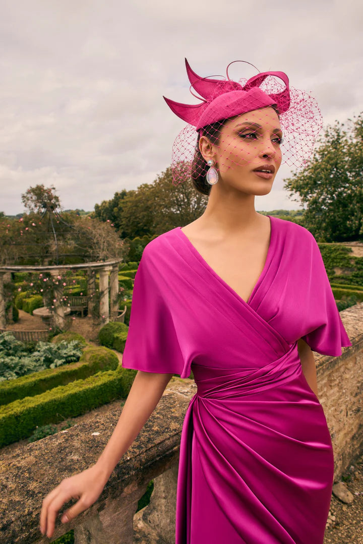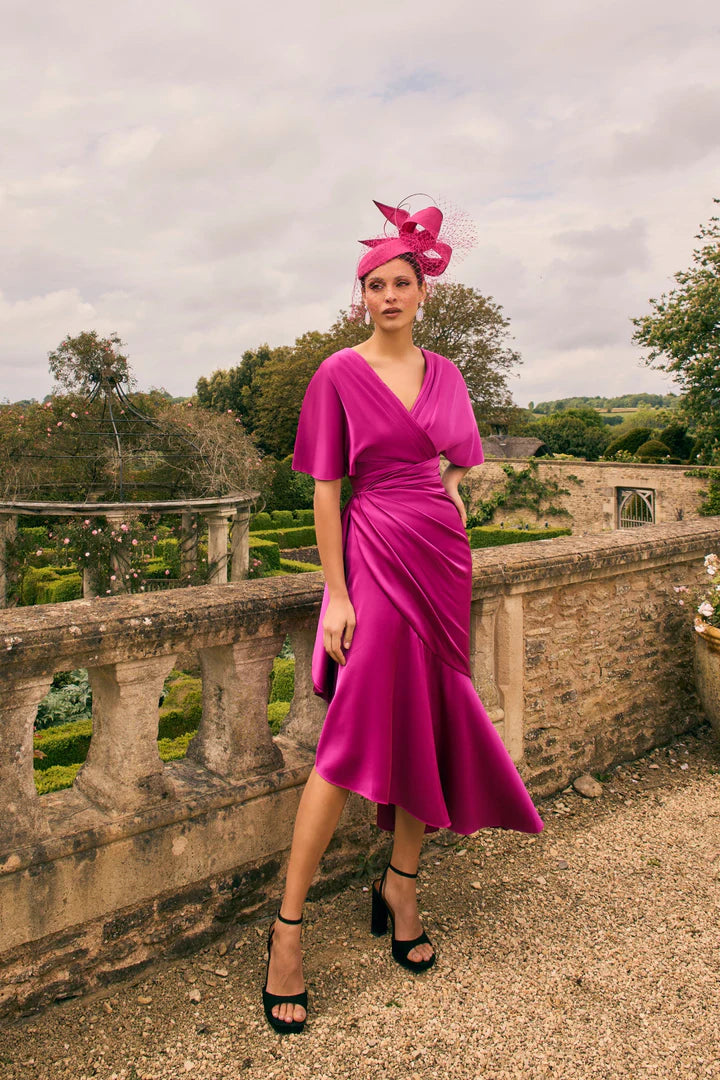 Sangria Satin Wrap Midi Dress with Cap Sleeves