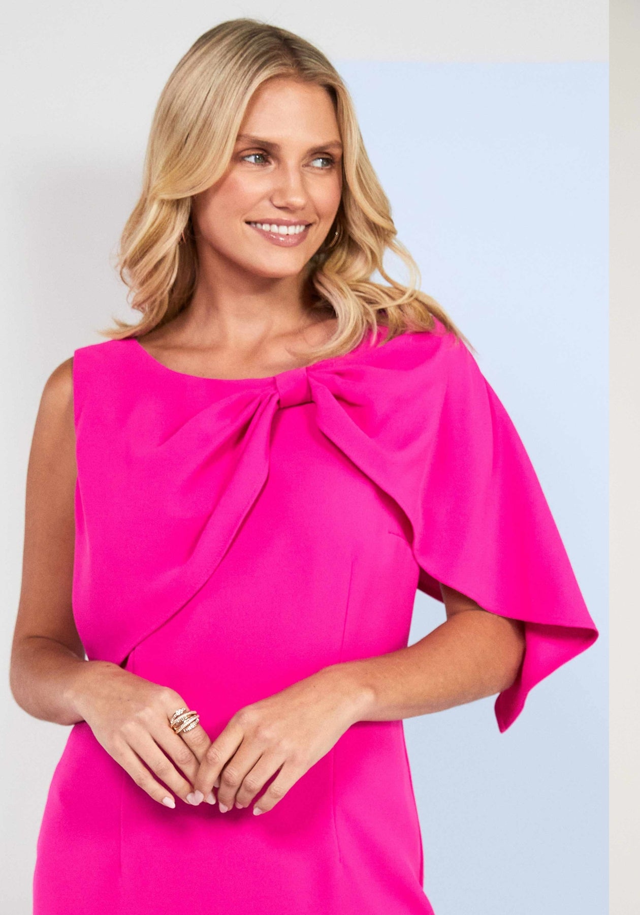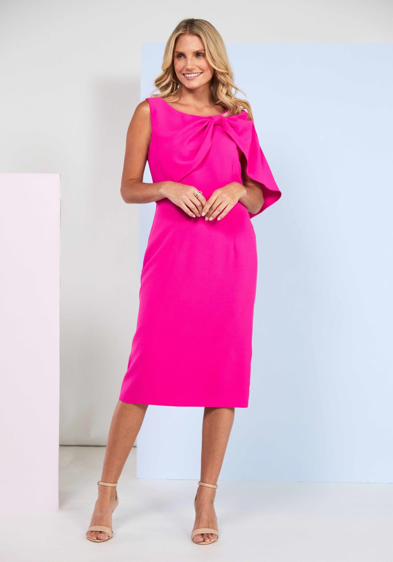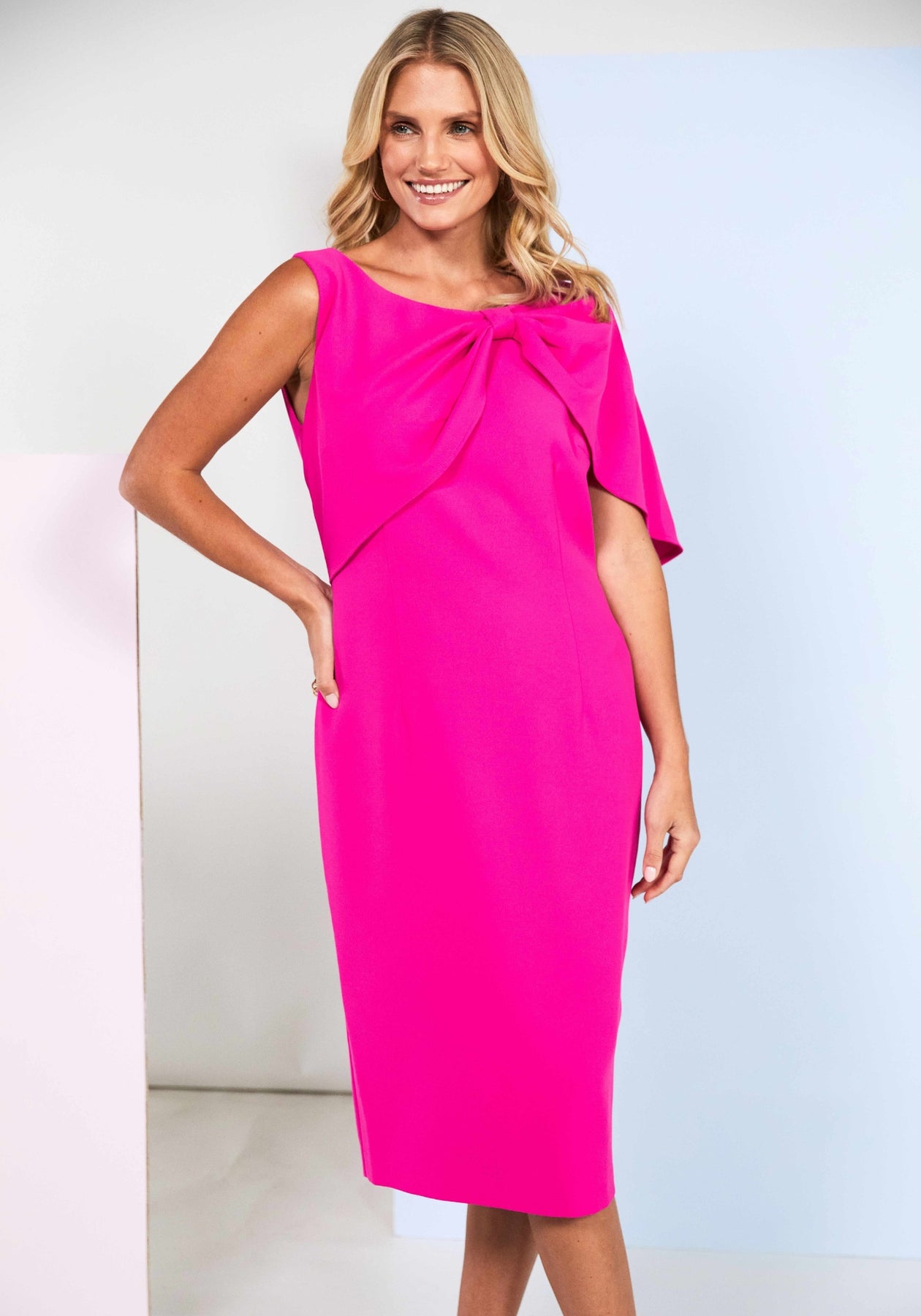 Make a statement in this striking hot pink plaid dress, elevated by an unexpected pleated bow cape that transforms an everyday look into something truly memorable. The bold geometric pattern catches the eye while the structured cape adds dramatic flair and movement with every step. Perfect for those who refuse to blend in, this piece combines playful sophistication with undeniable confidence. Whether you're heading to a special occasion or simply want to turn heads, this dress delivers impact without compromise. Embrace your bold side and let your style speak volumes.