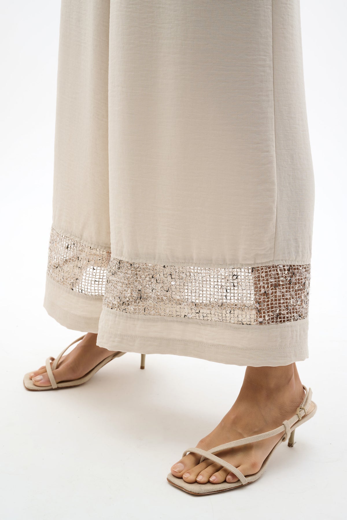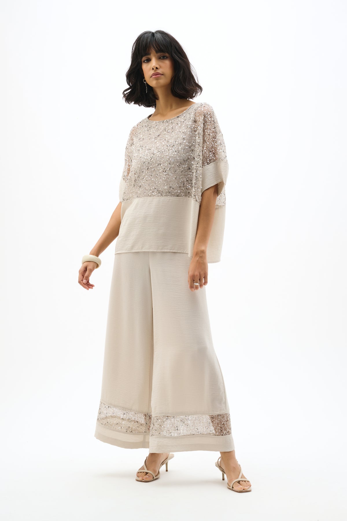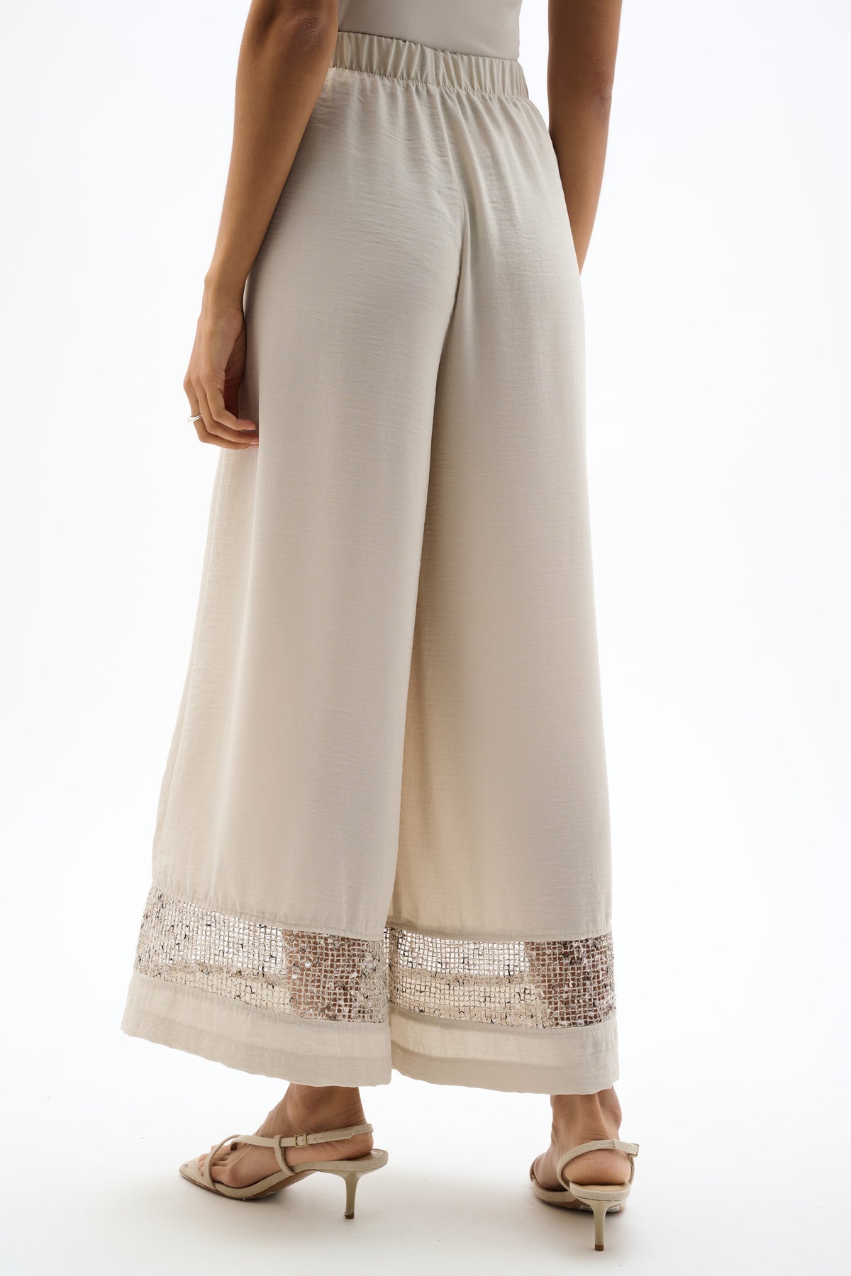 These lightweight gauze Culotte Pant feature a comfortable pull-on waistband and striking sequinned Mesh inserts at the hem. Unlined design enhances breezy movement, creating a modern, elevated silhouette for day or evening wear.