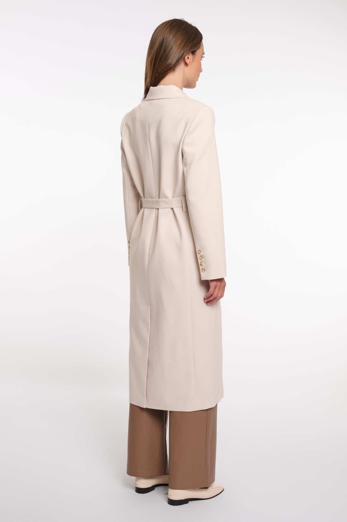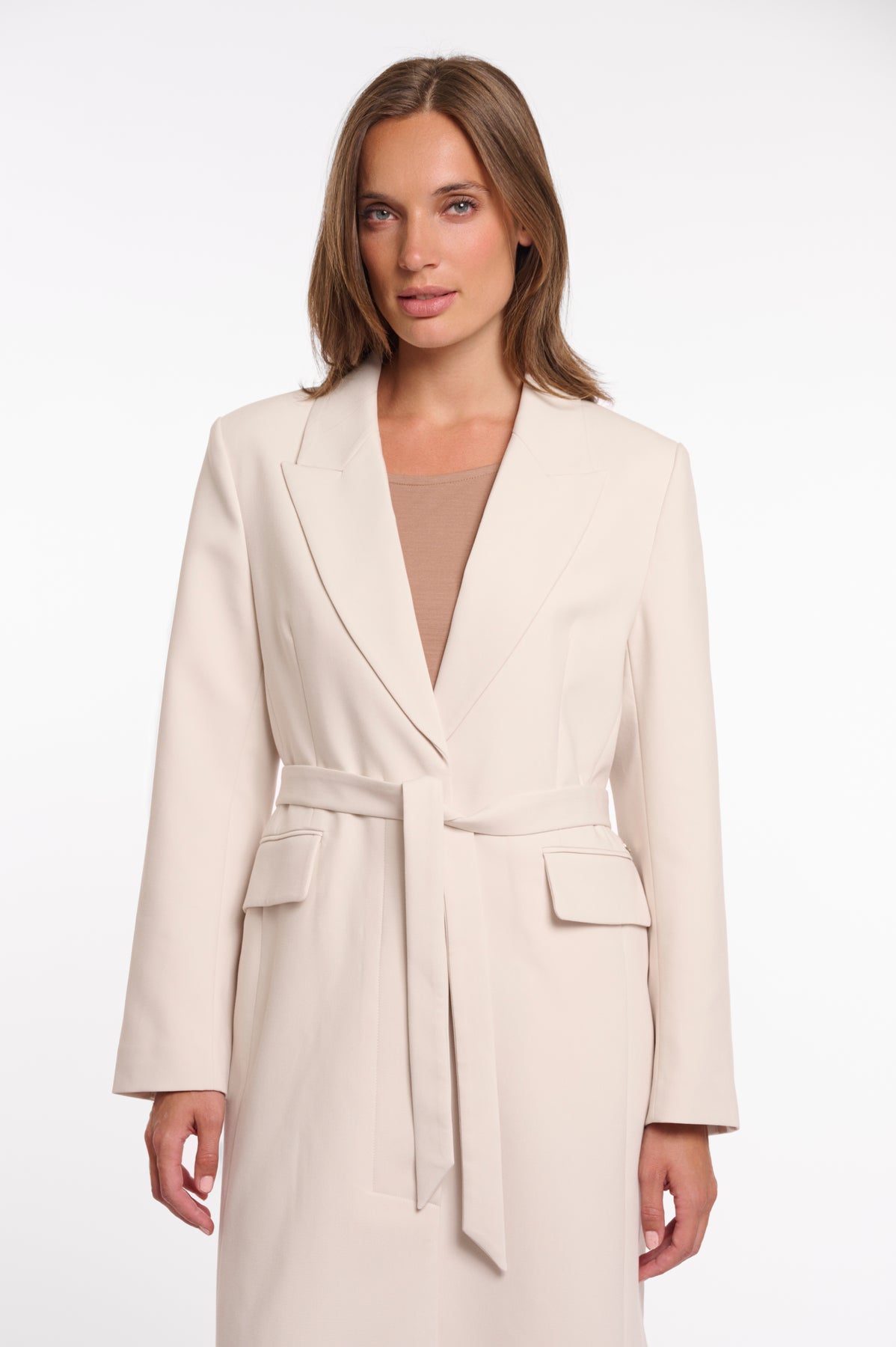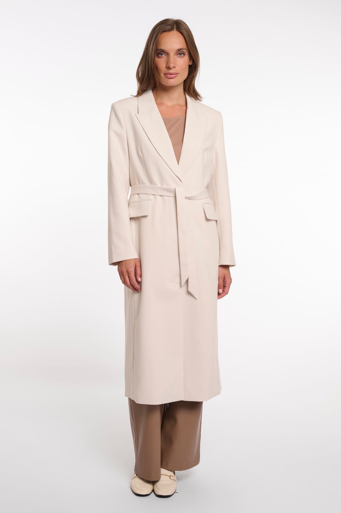 Wrap yourself in timeless sophistication with this long tailored coat, crafted in a refined woven blend for elegant structure and comfort. Designed with peaked lapels, a waist-defining belt, and front pockets, it brings a polished, feminine silhouette to any look. Finished with a back vent and four decorative buttons at the sleeve cuffs.