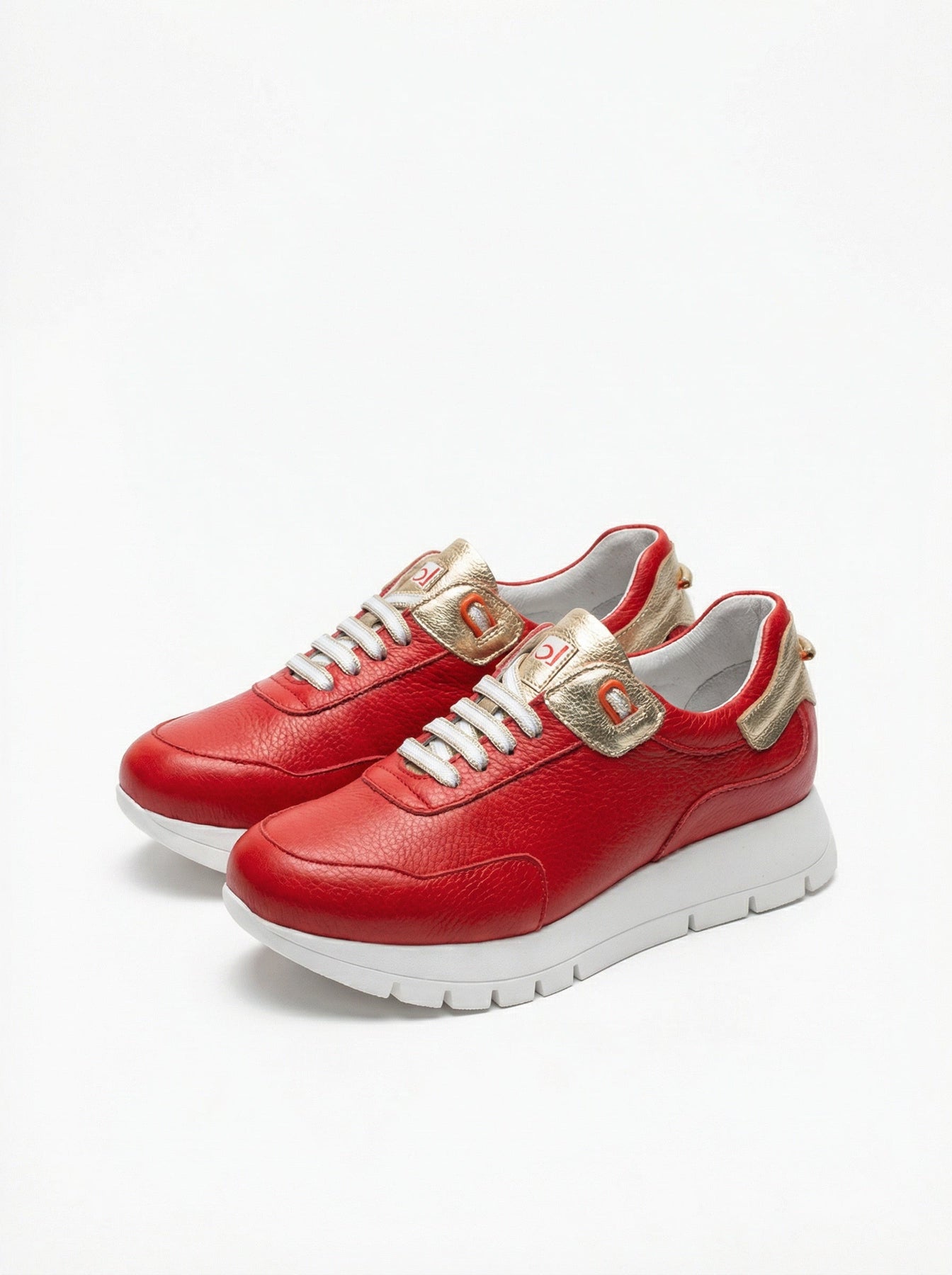 Bold red leather construction meets contemporary design in this striking lace-up platform runner. The 1.5-inch wedge heel provides subtle lift while maintaining comfort for all-day wear. Premium leather upper with secure lacing system ensures a customizable fit. The platform sole delivers modern edge and stability, making this versatile piece perfect for elevating casual outfits or adding attitude to everyday looks.