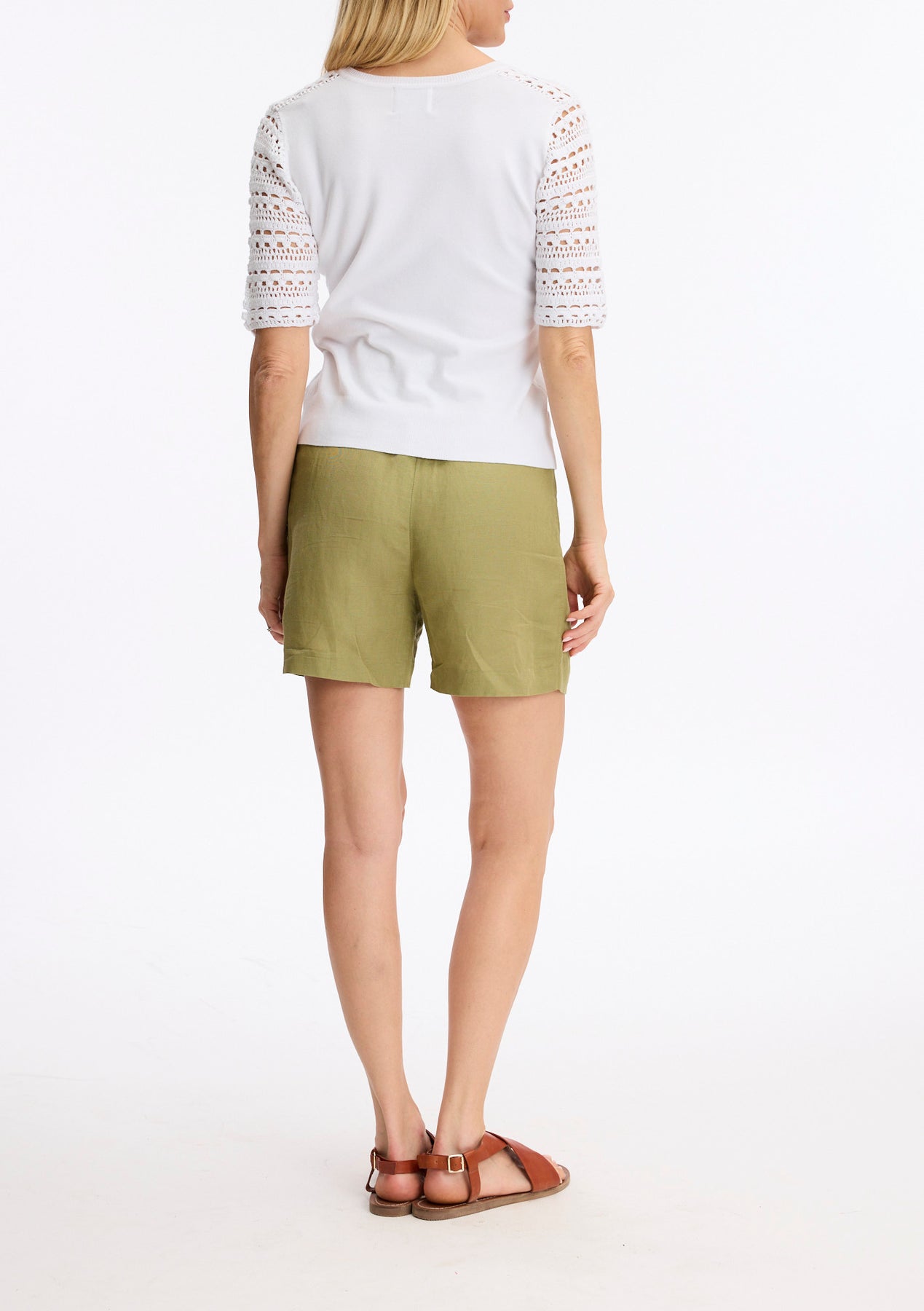 Elevate your wardrobe with this stunning white crochet sleeve top, where delicate craftsmanship meets modern elegance. The intricate crochet detailing on the sleeves adds texture and visual interest, while the classic round neckline flatters every face shape. Perfect for layering or wearing solo, this versatile piece transitions seamlessly from casual daytime looks to evening occasions. The breathable fabric keeps you comfortable throughout the day, and the timeless white hue pairs effortlessly with any bottoms in your collection. A must-have staple that brings sophistication and charm to your everyday style.